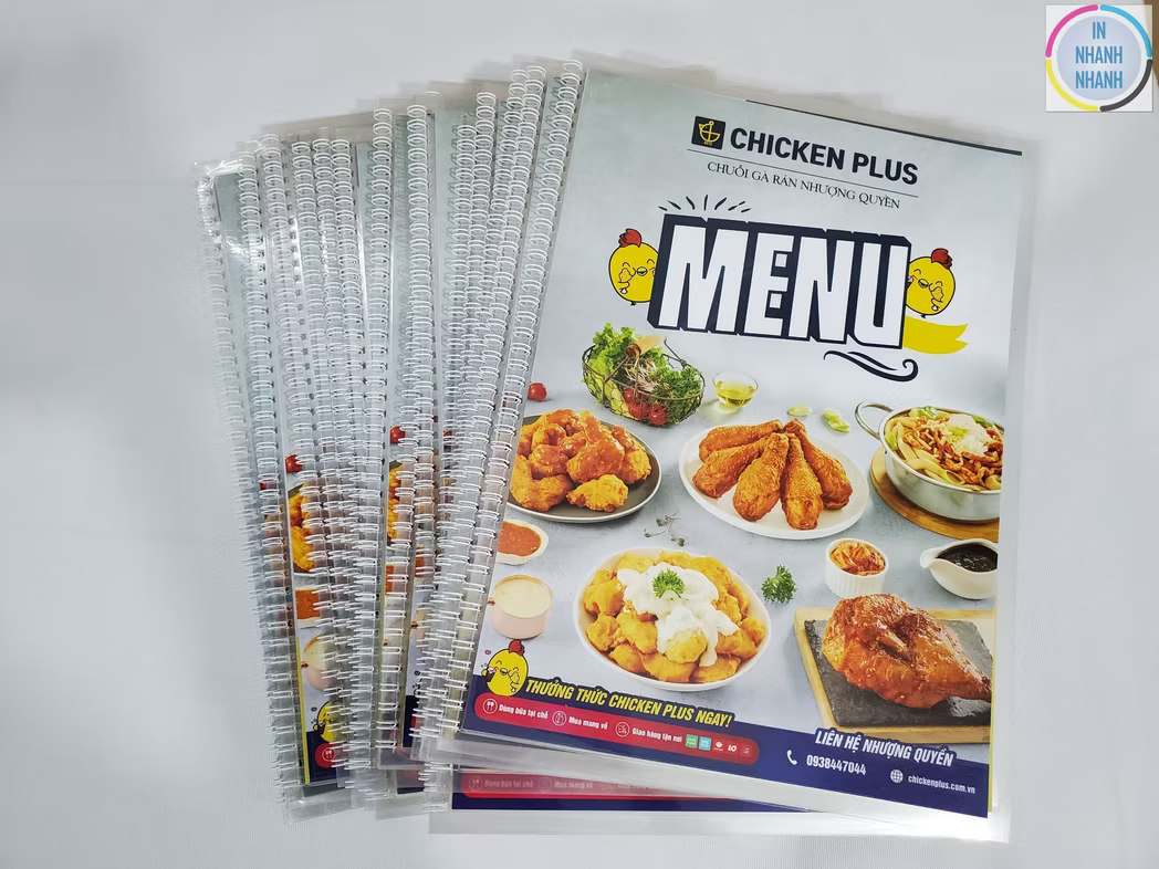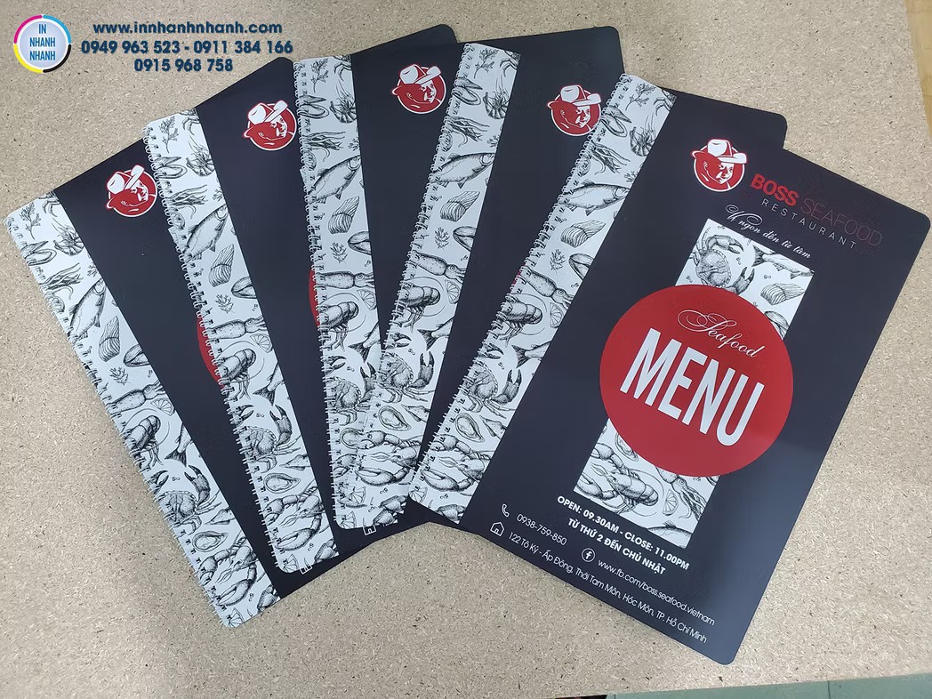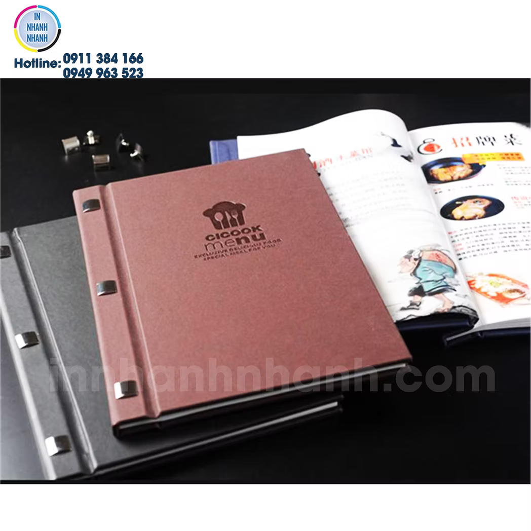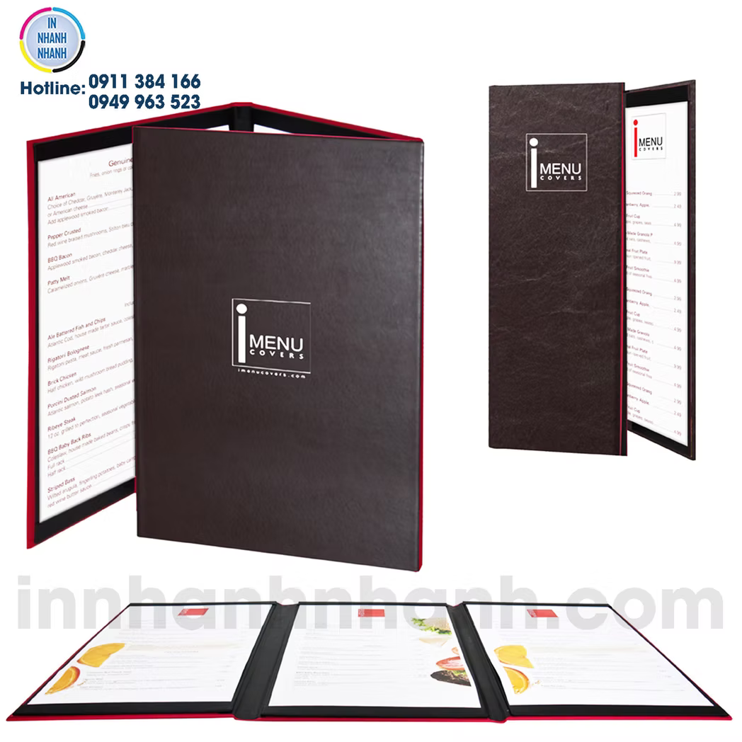 Dịch vụ in menu, thực đơn giá rẻ, đa dạng chất liệu như nhựa PVC, giấy, bìa cứng, bìa da, và gỗ. Liên hệ In Nhanh Nhanh để được báo giá chi tiết!